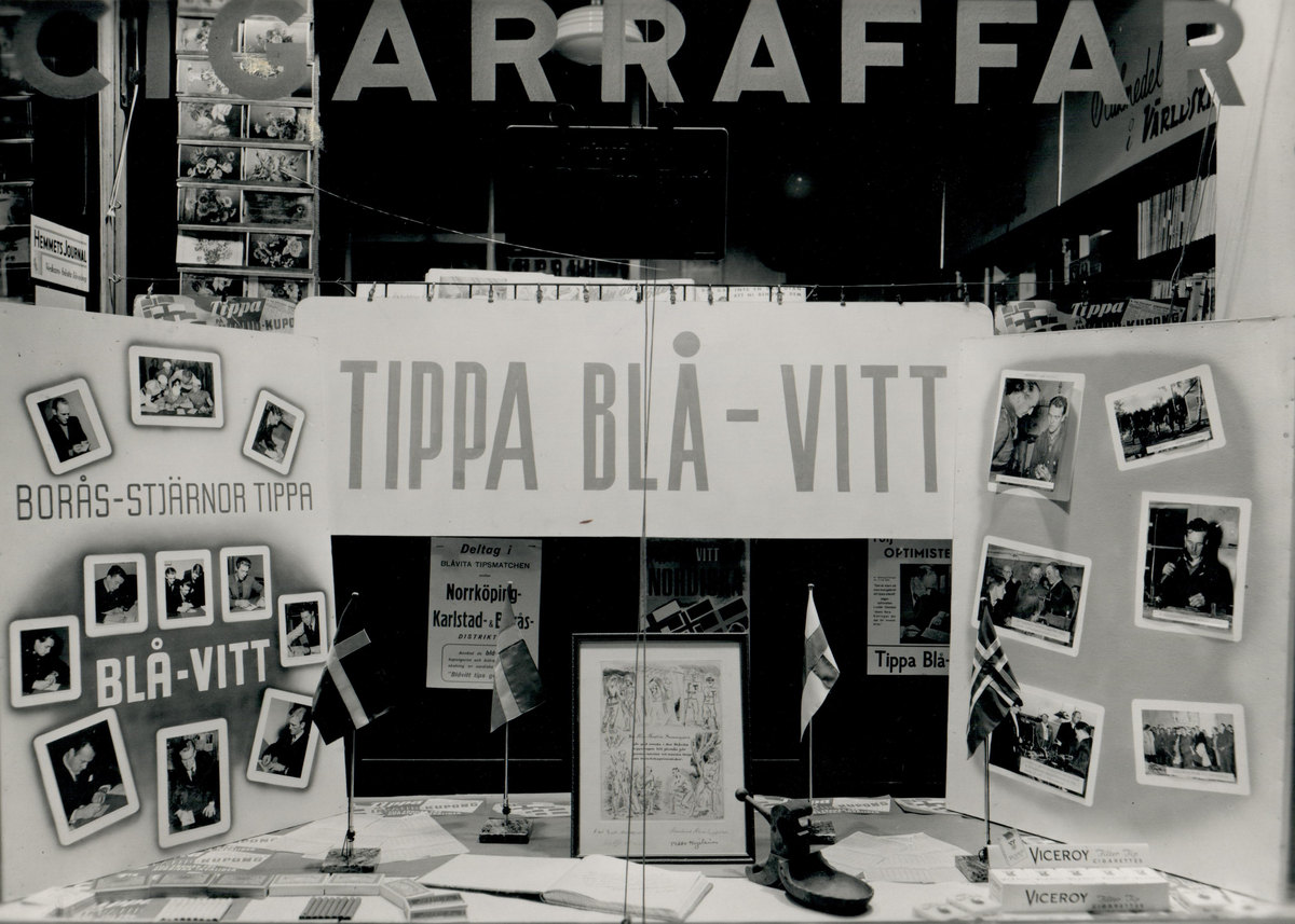 Skyltfönster i en cigarraffär med stryktipskuponger (Blå-vitt) och Viceroy-cigaretter.