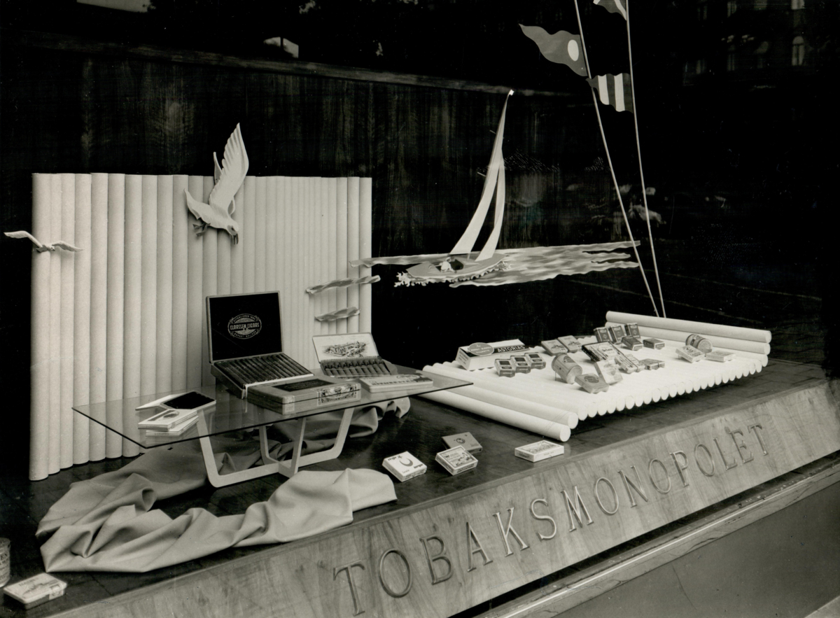 Skyltfönster vid Tobaksmonopolets butik med diverse cigaretter och cigarrer.
