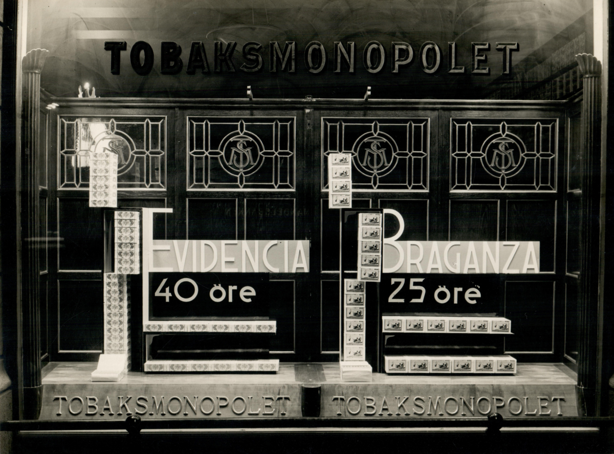 Skyltfönster som visar upp cigarrmärkena Evidencia & Braganza vid Tobaksmonopolets butik i Norrmalmstorg.