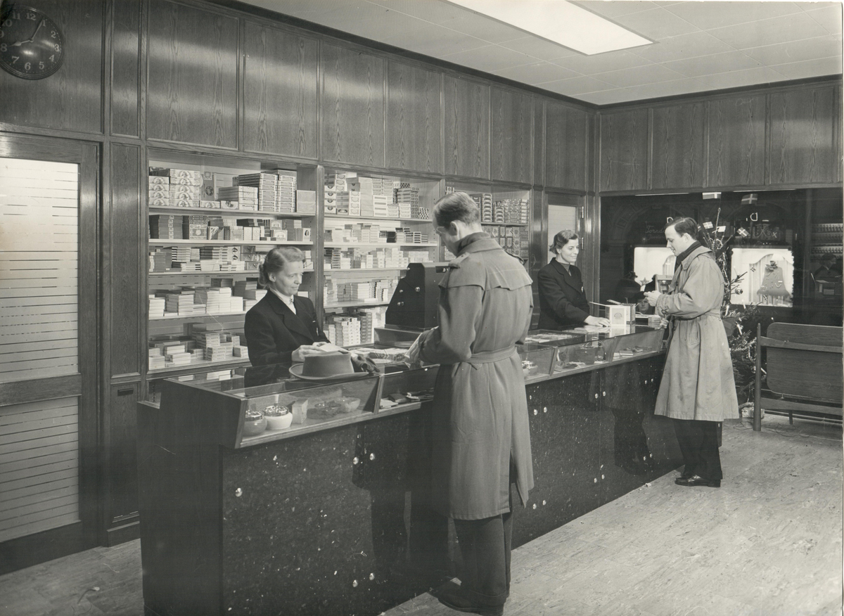 Ester Ekenberg och Andry Hörngren betjänar kunder i Tobaksmonopolets butik i Norrmalmstorg.