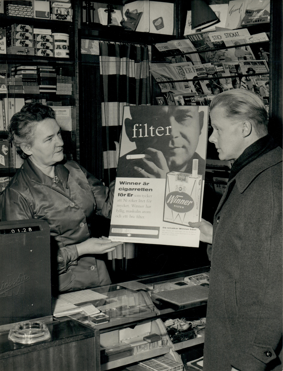 En reklamposter för Winner-cigaretter hålls upp i en tobakshandel.