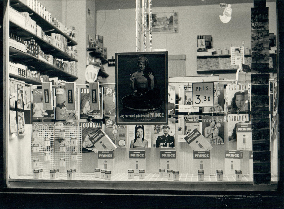 Skyltfönster med reklam för Prince-cigaretter vid Rolands tobaks- & tidningsaffär.