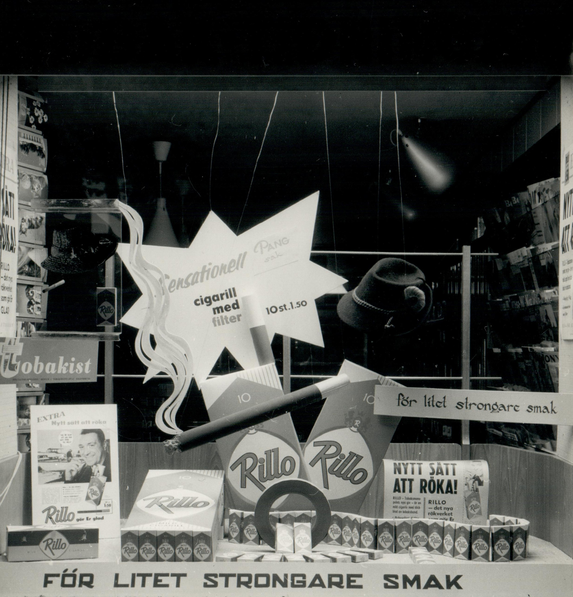 Reklam för Rillo-cigariller i ett skyltfönster i en tobakshandel.