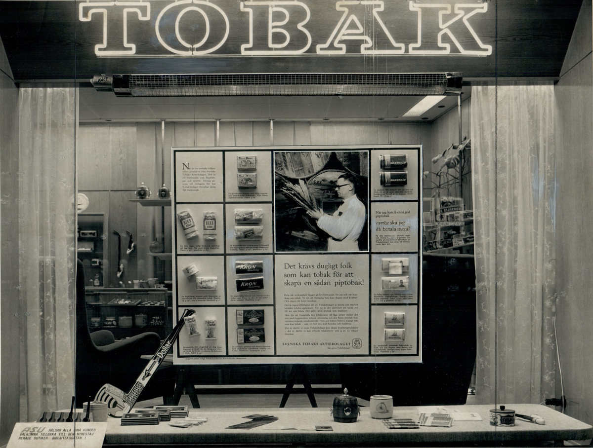 Skyltfönster hos en tobakshandel med reklam för piptobak.