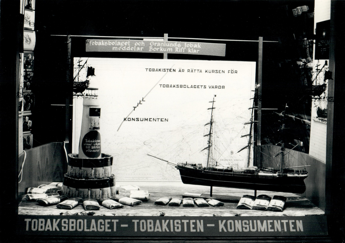 Skyltfönster med reklam för Borkum Riff hos Granlunds tobaksaffär i Trollhättan.