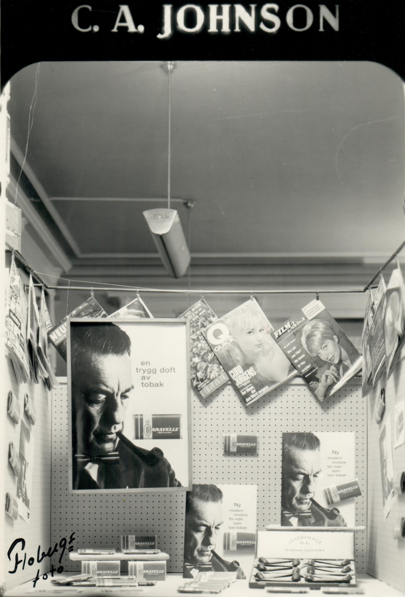 Skyltfönster med reklam för Caravelle i C.A Johnsons tobakshandel i Karlskrona.