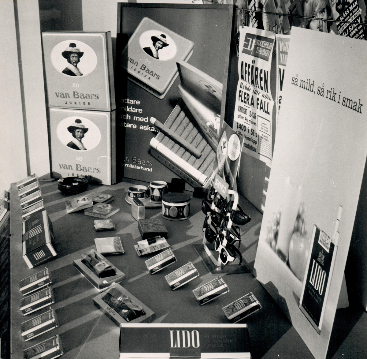 Skyltfönster med tobaksprodukter, däribland cigariller av märket van Baars och cigaretter av märket Lido. F.o Tannlunds eftr., Prästgatan 19, Östersund.