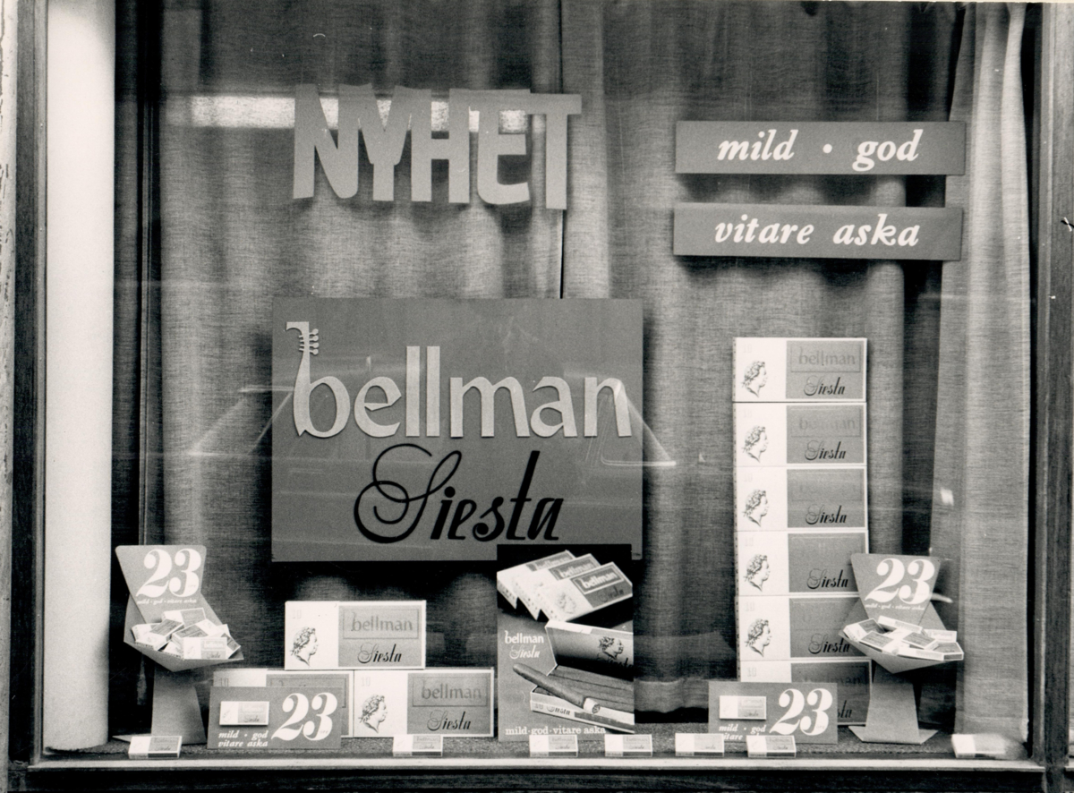Skyltfönster i G. Svedenströms tobakshandel med rekam för cigarillmärket Bellman Siesta. Rådhusgatan, Östersund.