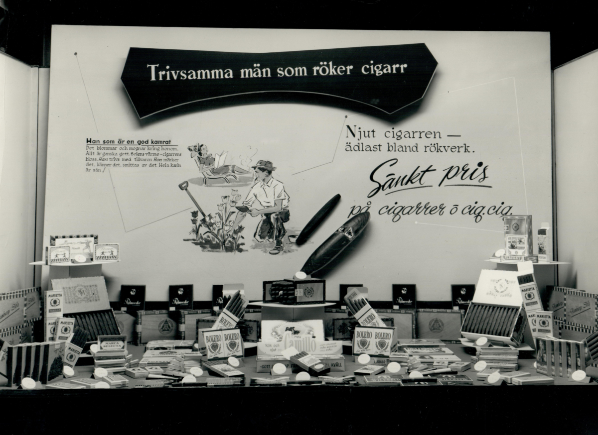 Skyltfönster med reklam för diverse cigarrvarumärken.