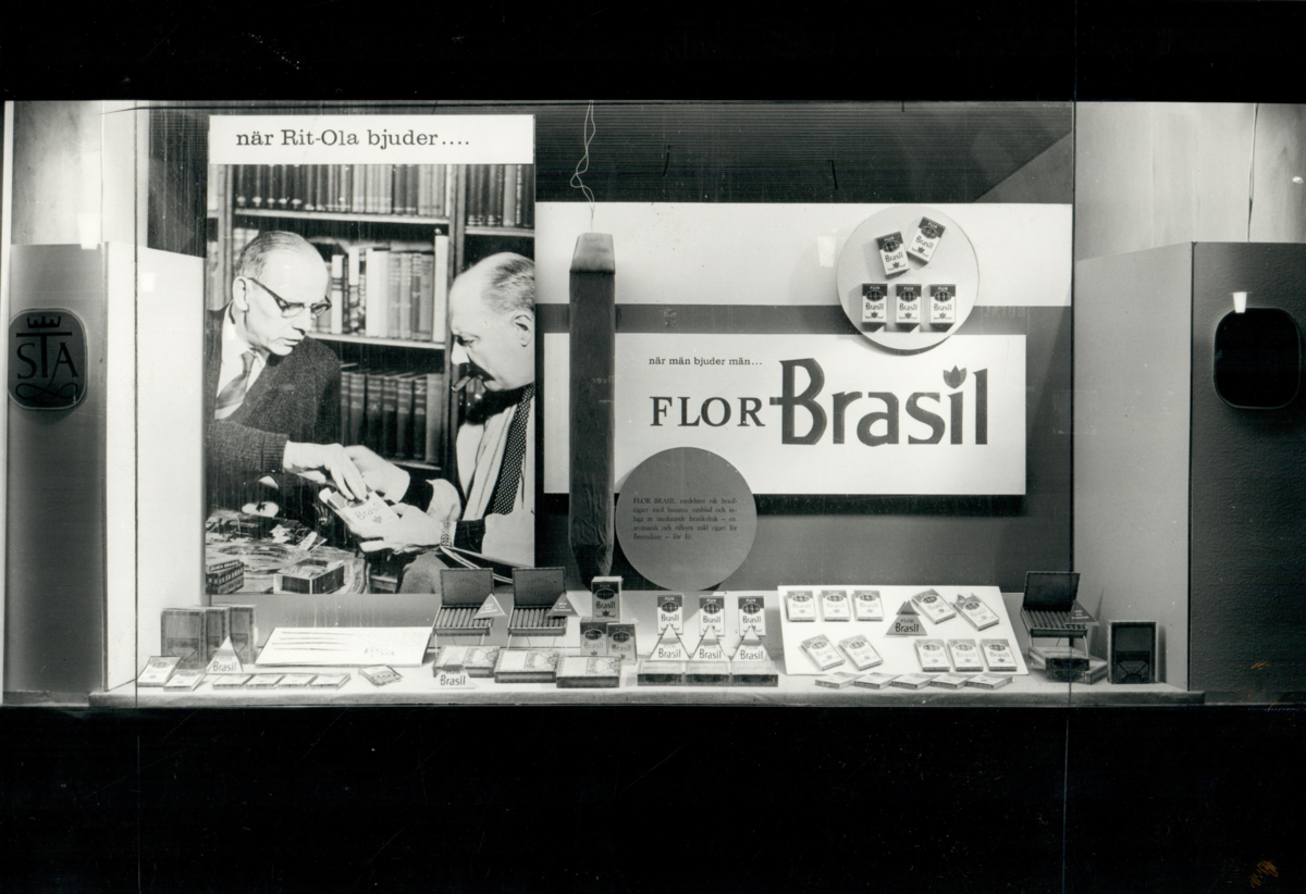 Skyltfönster i en tobakshandel med reklam för cigarrvarumärket Flor Brasil.