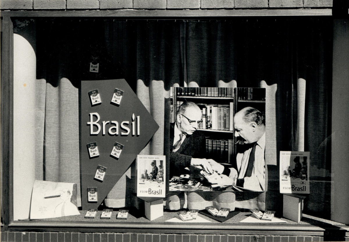 Skyltfönster med reklam för cigarrvarumärket Flor Brasil.