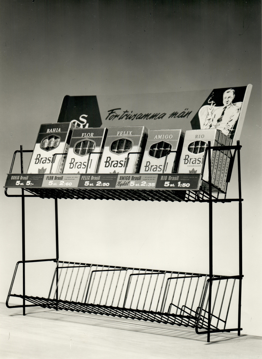 Cigarr- och cigarillpaket av märket Brasil på ett ställ.