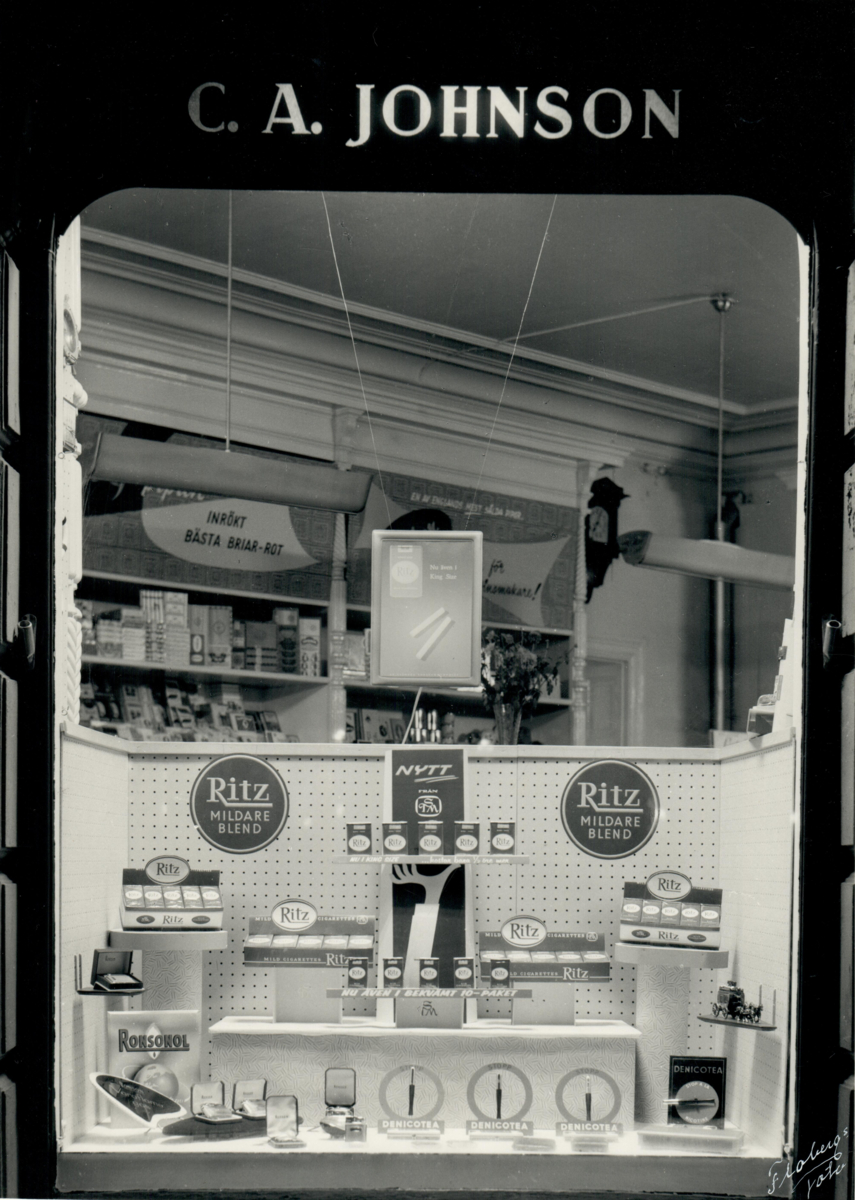 Skyltfönster i C.A. Johnsons tobakshandel med reklam för Ritz-cigaretter, Karlskrona.