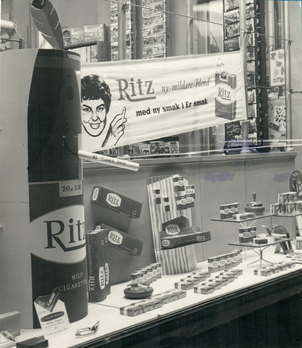 Skyltfönster med reklam för Ritz-cigaretter i Växjö. Bild tagen november 1955.