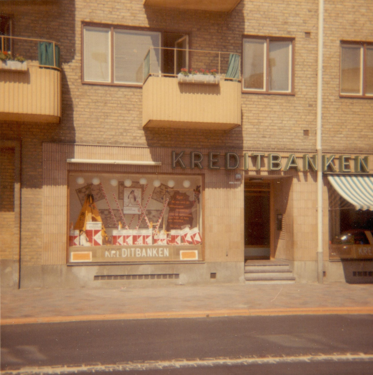 Skyltfönster med diverse tobaksprodukter. Kreditbanken, Dalaplan, Malmö. Bild tagen i maj 1964.