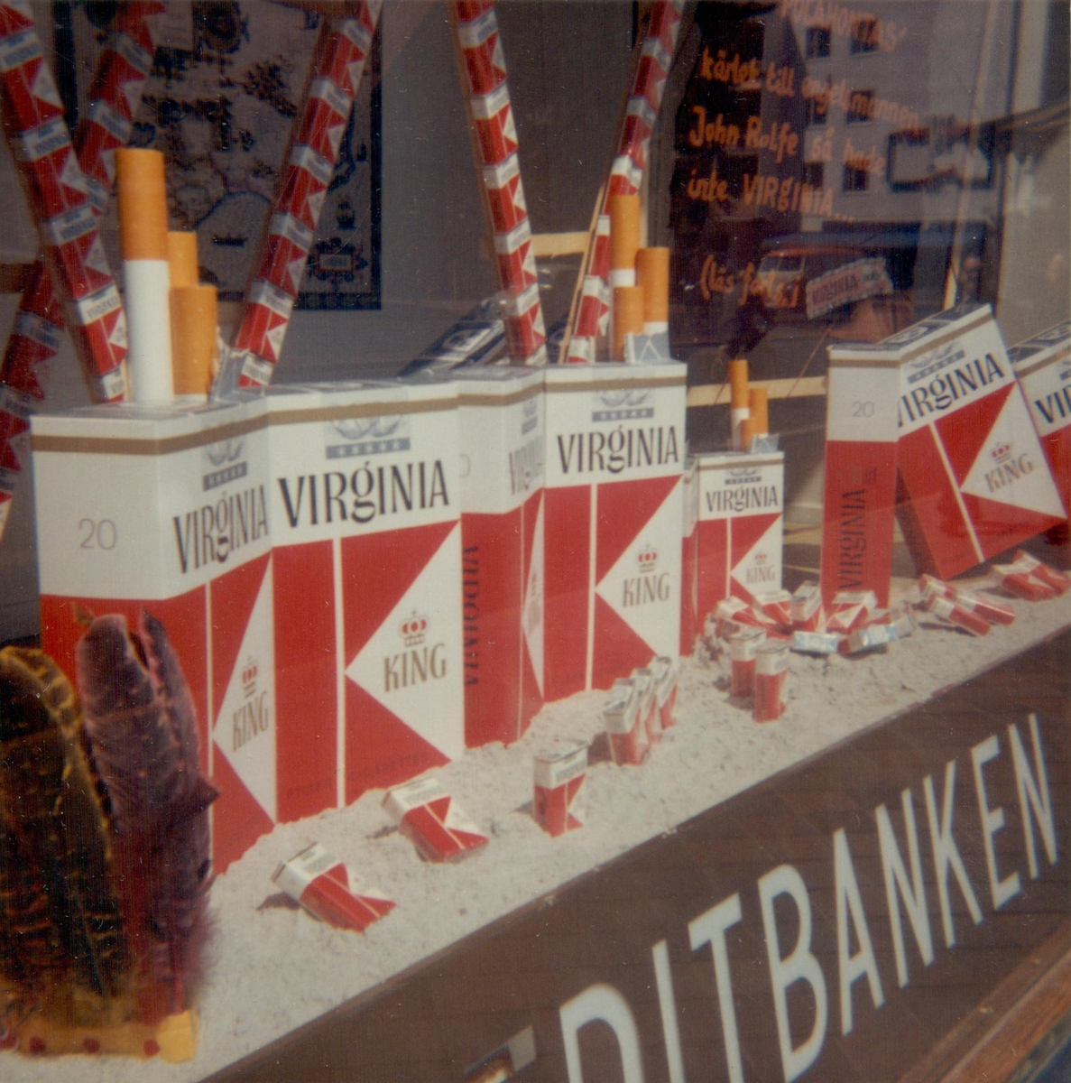 Skyltfönster med reklam för Virginia King-cigaretter. Kreditbanken, Dalaplan, Malmö. Bild tagen i maj 1964.