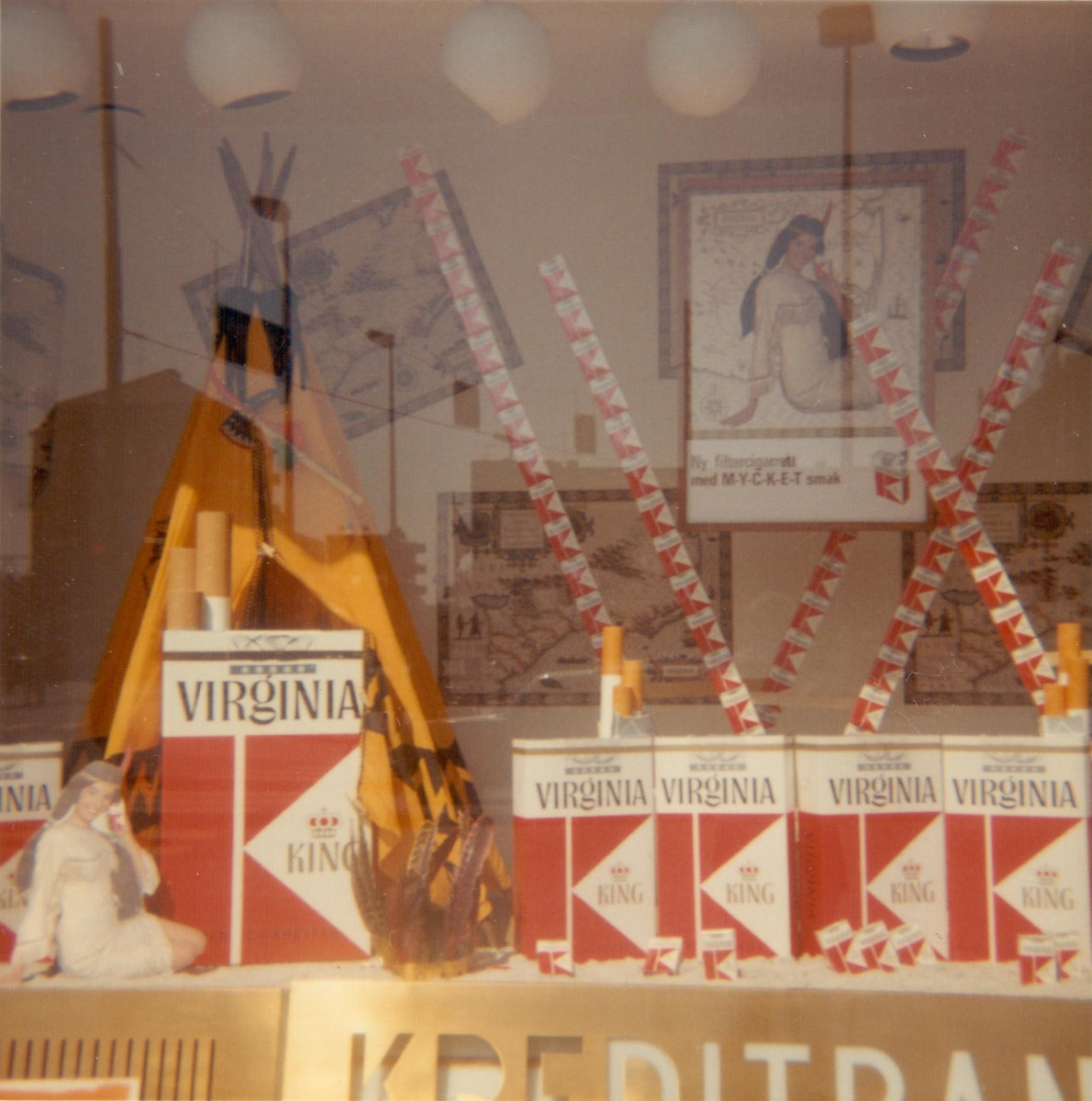 Titel: Skyltfönster med reklam för Virginia King-cigaretter. Kreditbanken, Dalaplan, Malmö. Bild tagen i maj 1964.