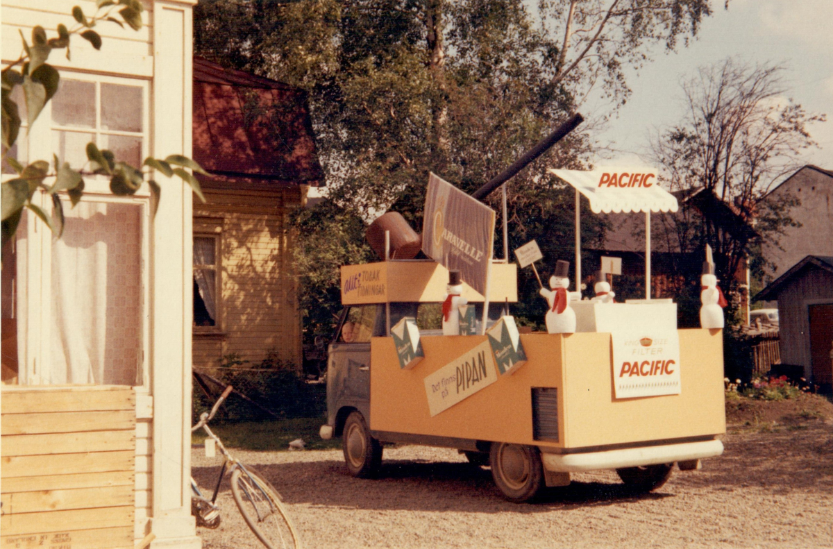 En Volkswagen-pickup med reklam för tobaksaffären Pipan under Barnens dag i Sollefteå 1961.