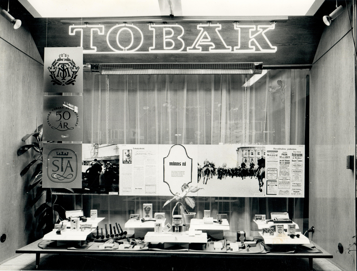 Svenska Tobaks AB 50-årsjubileum 1965. Skyltfönster i en tobakshandel.