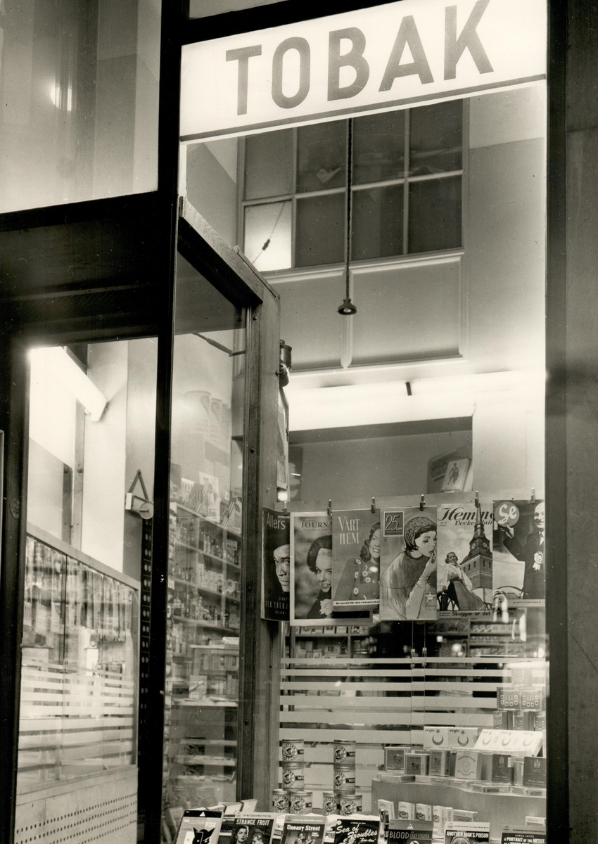 Skyltfönster i en tobakshandel med reklam för diverse tobaksprodukter.