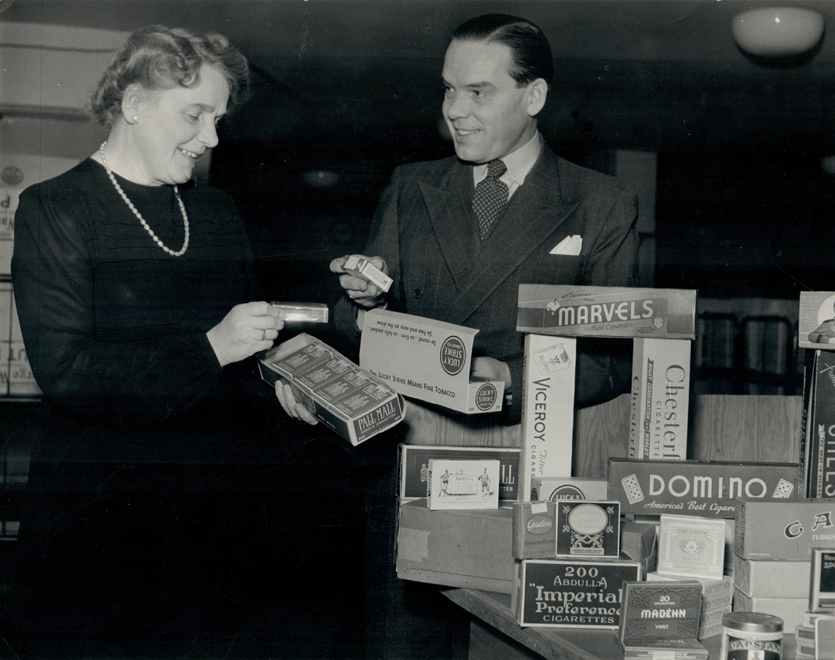 Tobakshandlare håller i cigarettpaket av märkena Pall Mall respektive Lucky Strike.
