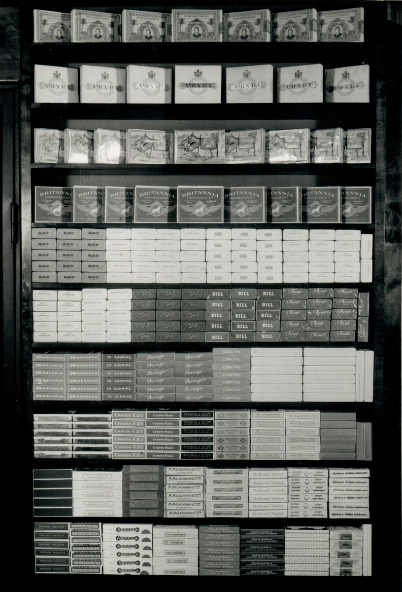 Diverse cigarettmärken i en tobakshandel.