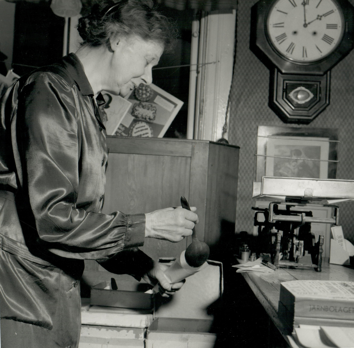 Titel: Fröken Nanny Modin väger upp snus i lösvikt i tobaksaffären Snus-Lundgrens i Växjö.