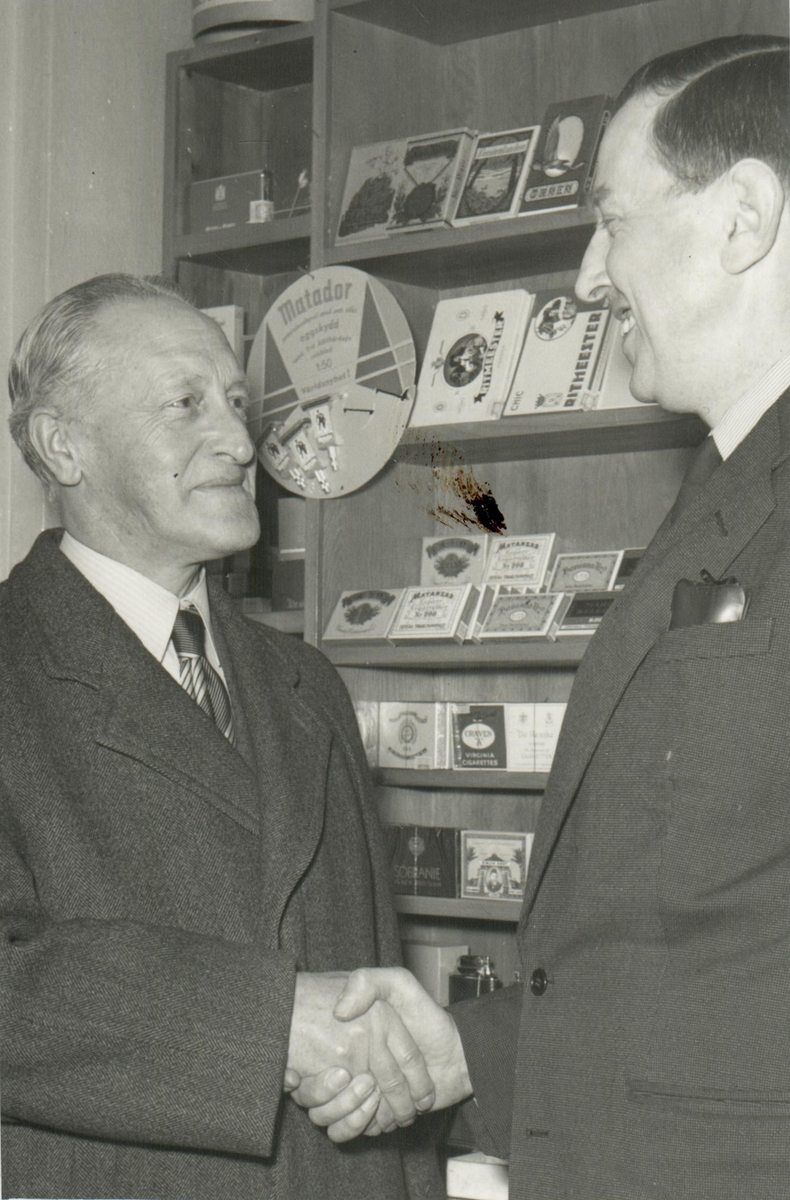Två herrar skakar hand i en tobakshandel.
