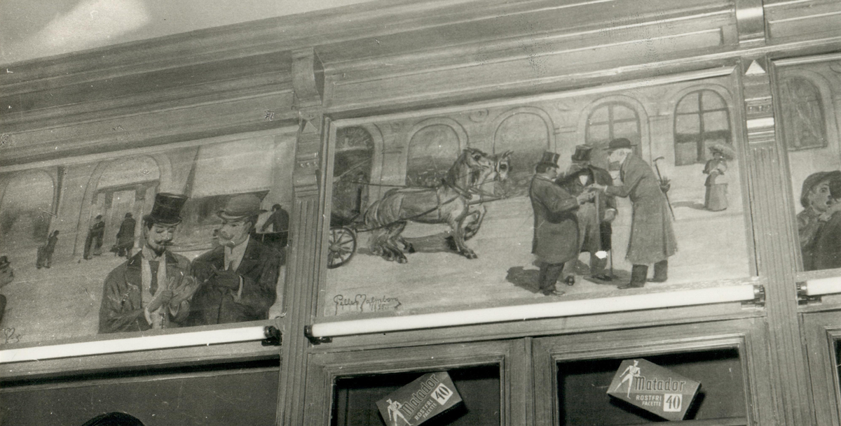 Konstverk av Pelle Malmborg gjort 1895. Tobakshandel, interiör.