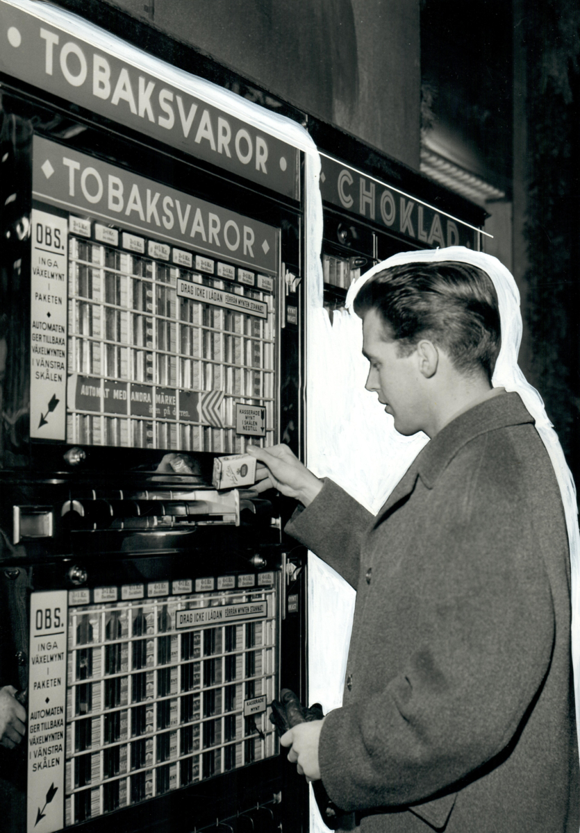 En man köper John Silver-cigaretter från en cigarettautomat.