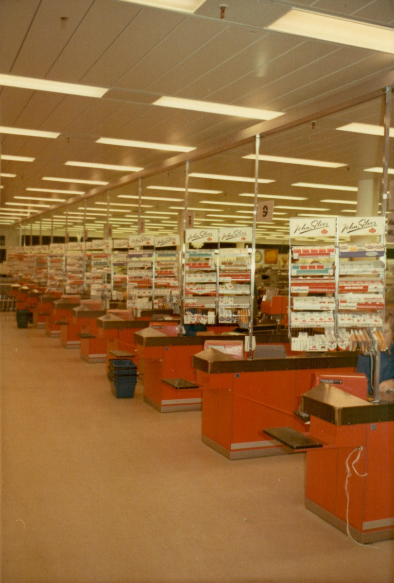 John Silver-cigaretter finns i ett ställ intill kassan i varuhuset Domus i Östersund, 1970.