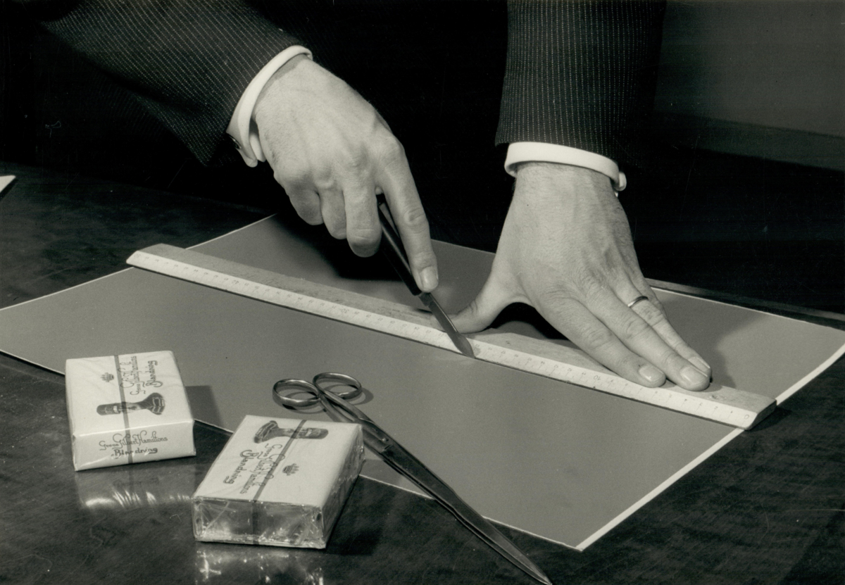 Förberedelse inför skyltning av piptobaken Greve Gilbert Hamiltons blandning.
