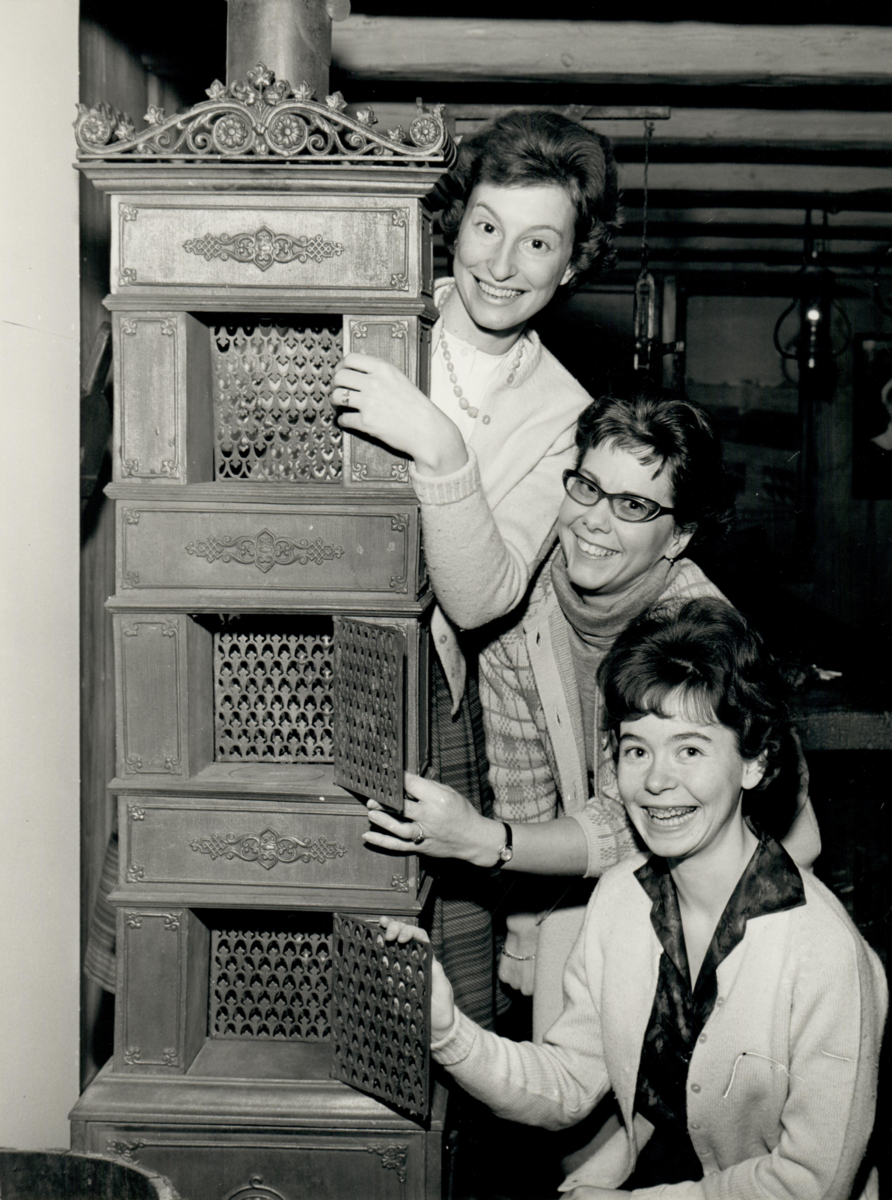 Tre kvinnor står intill en etagekamin i Svenska Tobaksmonopolets museum.