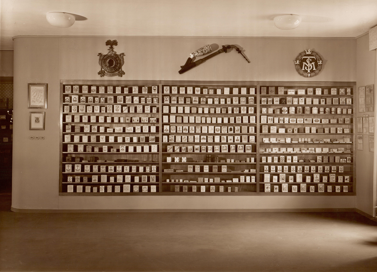 Hyllor fyllda med diverse tobaksprodukter i Svenska Tobaksmonopolets museum.