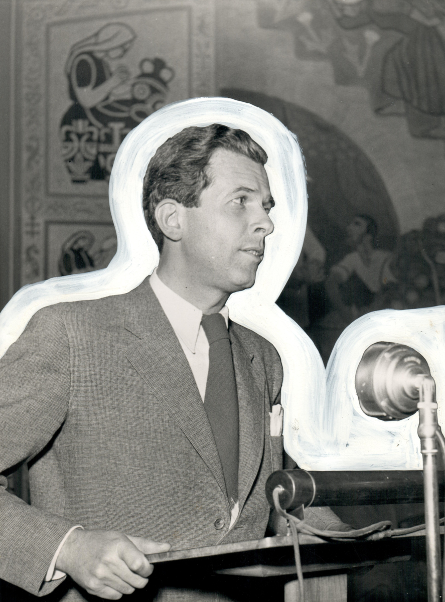 Bo Beskow håller tal i Tobaksmonopolets matsal 1947 i samband med invigningen av hans al fresco-målning (som syns till i bakgrunden).