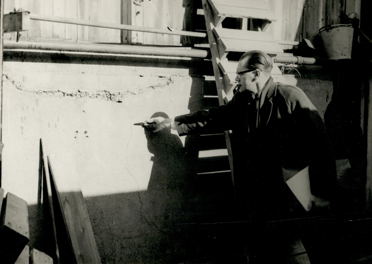 En man inspekterar en grund i samband med flytten av Gubbhyllan till Skansen.