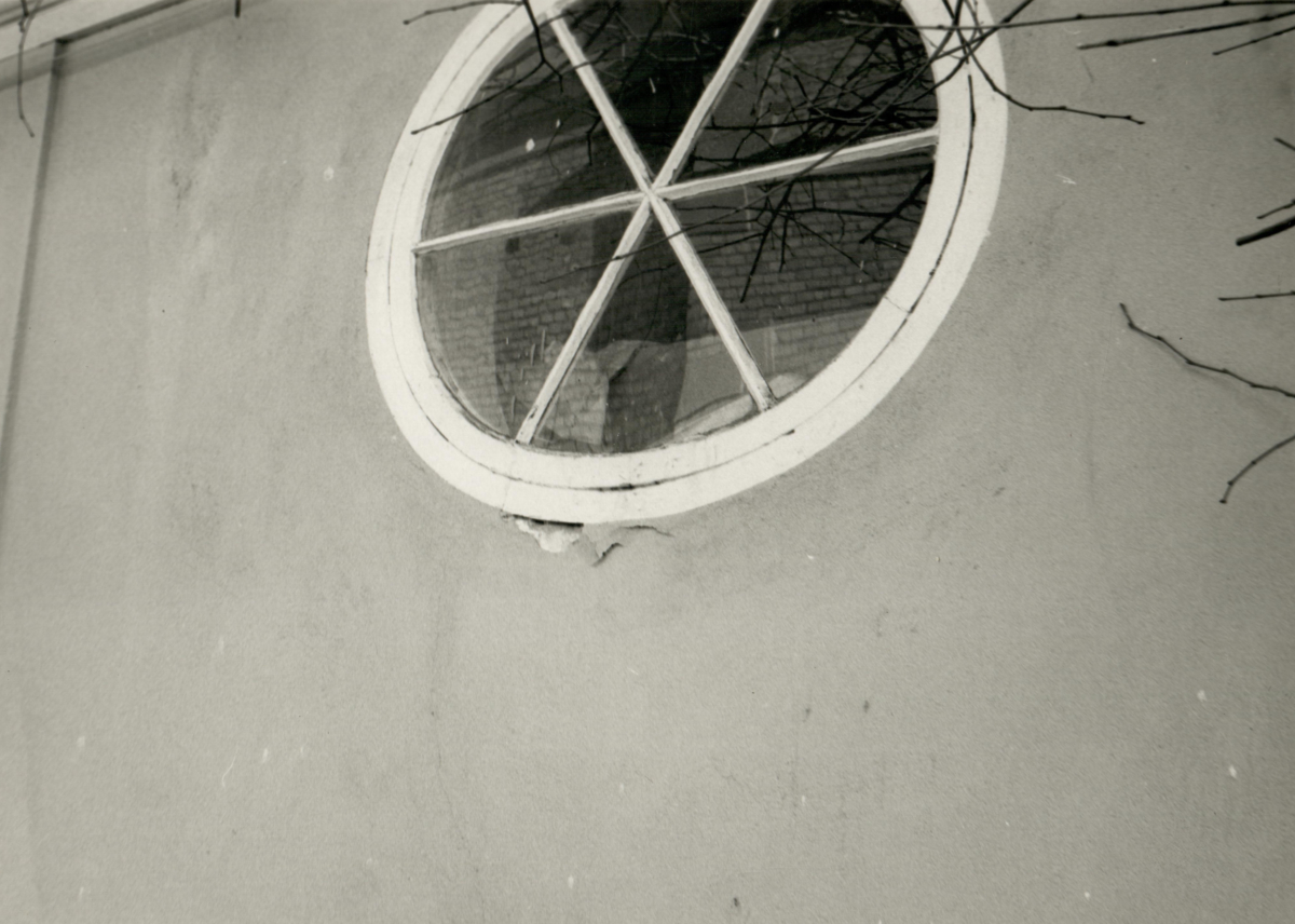 Fasad med runt fönster.