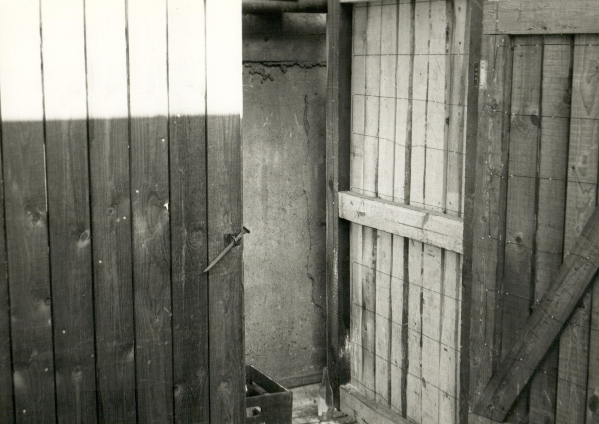 En dörr står vidöppen. På insidan av dörren står en drickaback och en tom glasflaska.