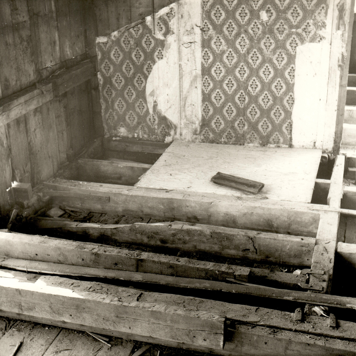Interiör av ett rum i Gubbhyllan på Hasselbacken under rivning.