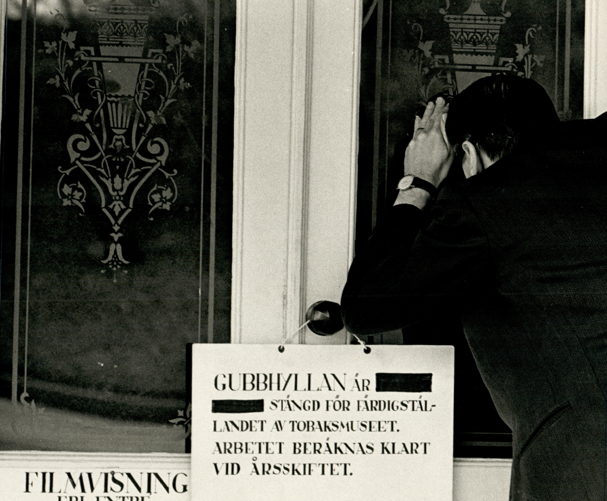 En man tittar in genom fönstret i entrédörren av Gubbhyllan 1967.
