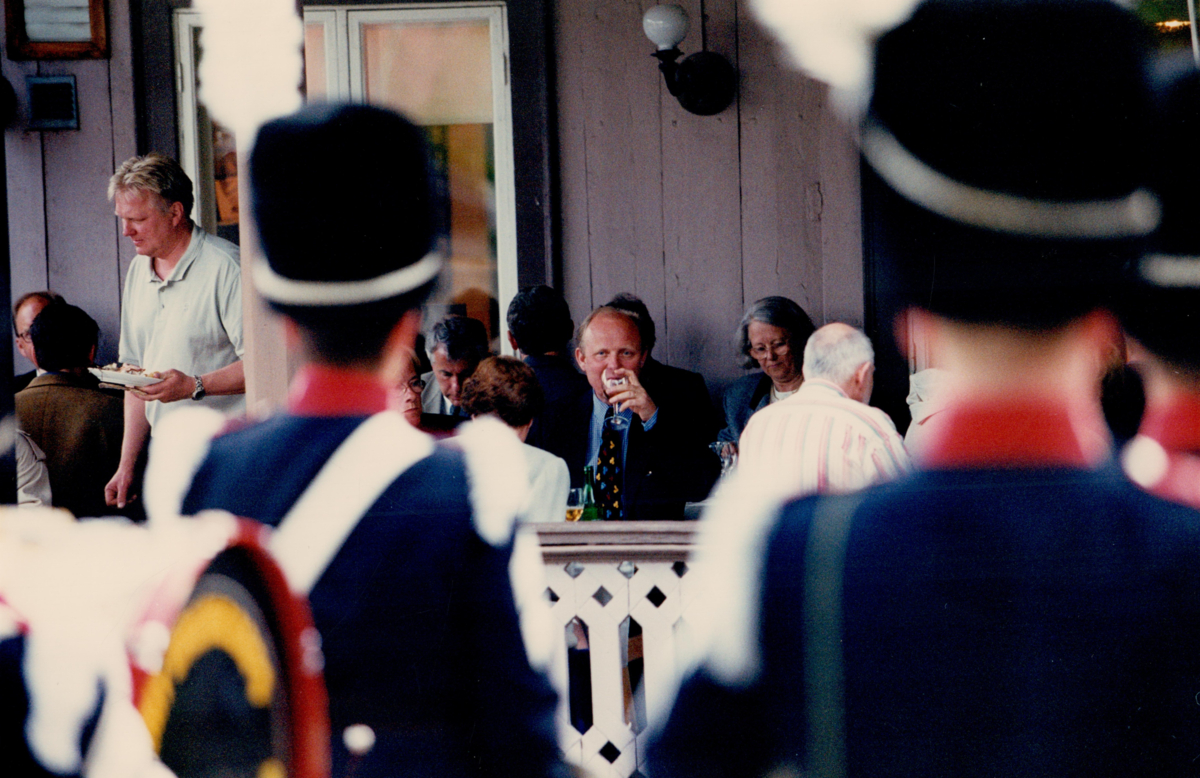Besökare äter på Gubbhyllan i samband med Tobaks- och Tändsticksmuseums invigning år 2000.