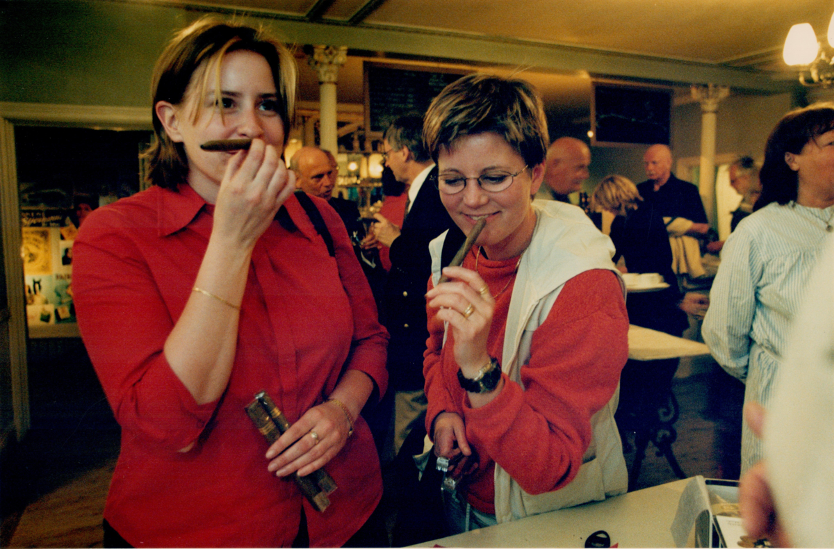 Besökare luktar på cigarrer vid Tobaks- och Tändsticksmuseums invigning år 2000.