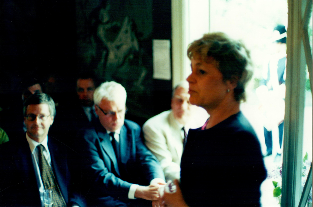 Titel: Museichef Inga Junhem håller tal vid Tobaks- och Tändsticksmuseums invigning år 2000.