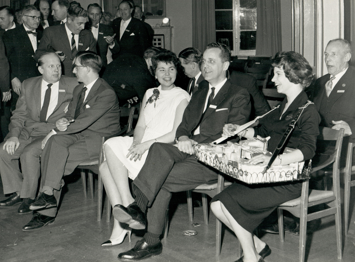 En kvinna med låda på magen, fylld med cigarettpaket, vid middagen på Trädgårn i Göteborg.