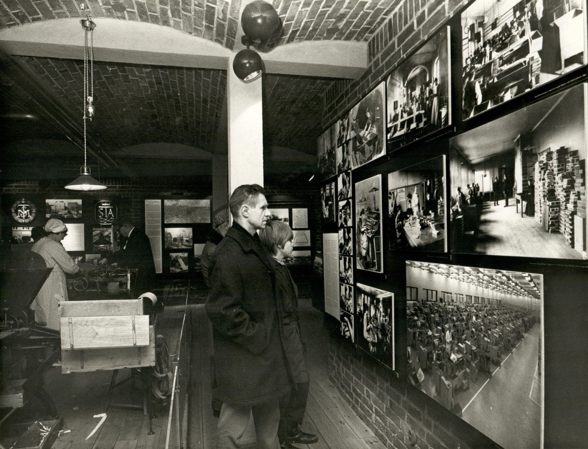 Museibesökare studerar bildmontaget i källaren över cigarrtillverkningens utveckling i Tobaksmuseet, julen 1968.