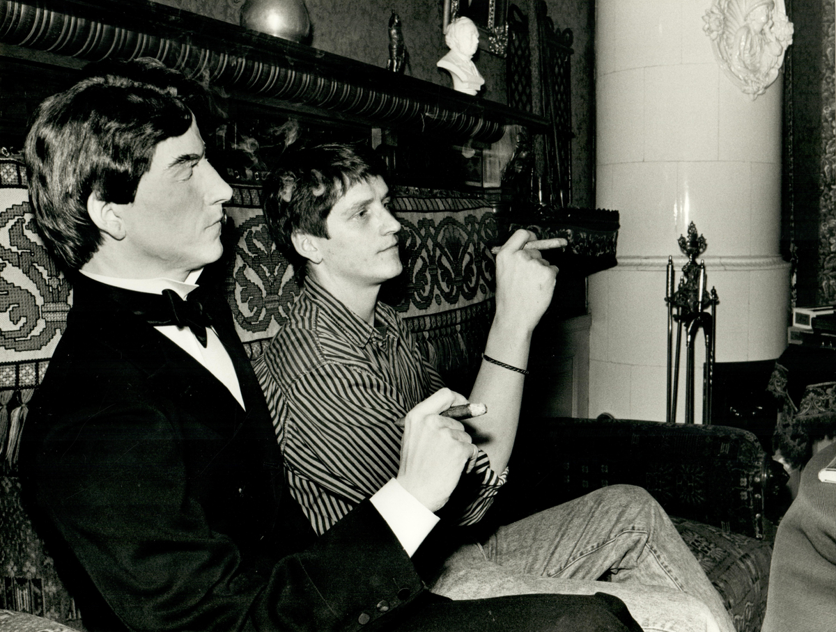 En man sitter bredvid en docka på en soffa i Tobaksmuseet.