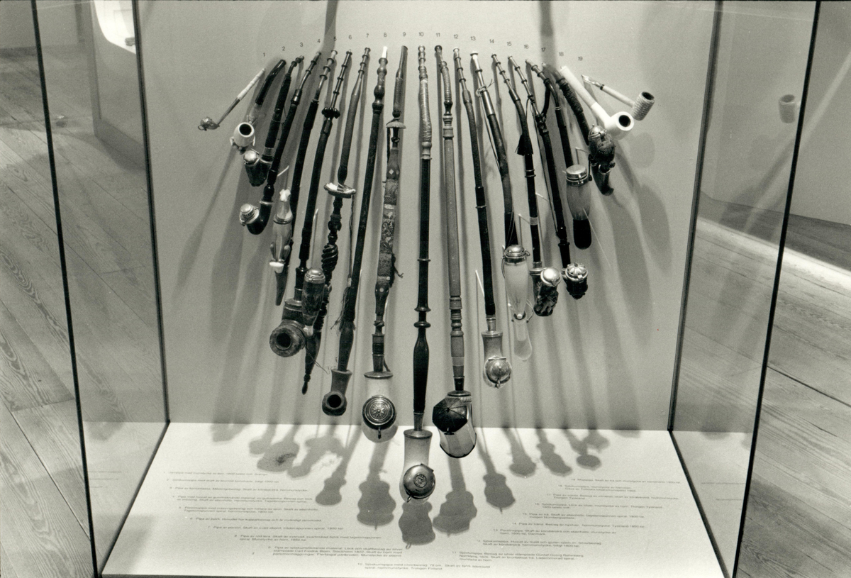 Diverse tobakspipor i en monter på Tobaksmuseet, mars 1991.