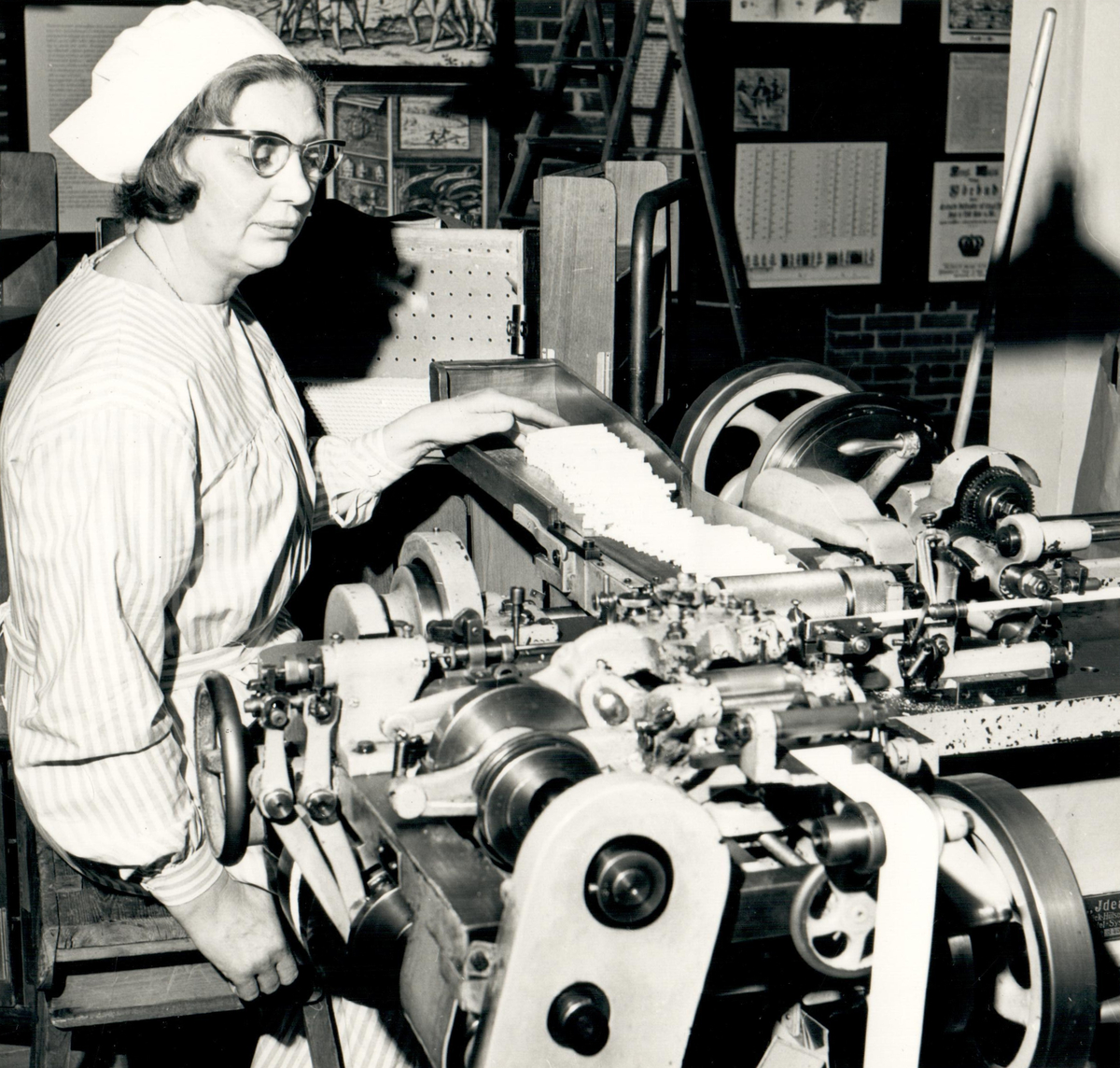 Hylsorna till munstyckcigaretten Bridge framställs i "fabriken" på Tobaksmuseet på Skansen av fru Siri Carlsson, 1960-tal.