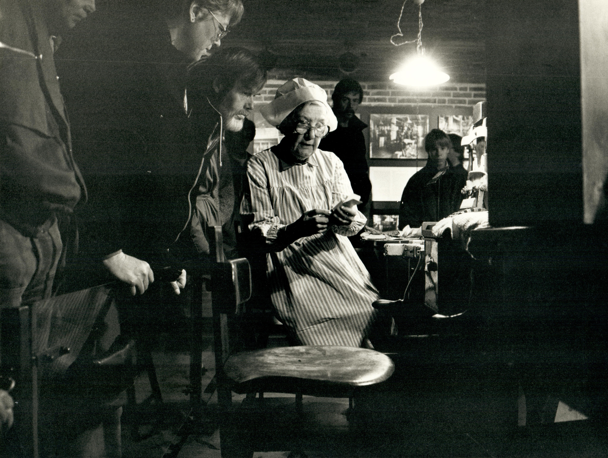 Museibesökare ser på när tobaksfabrikanten jobbar i "fabriken" i Tobaksmuseet.