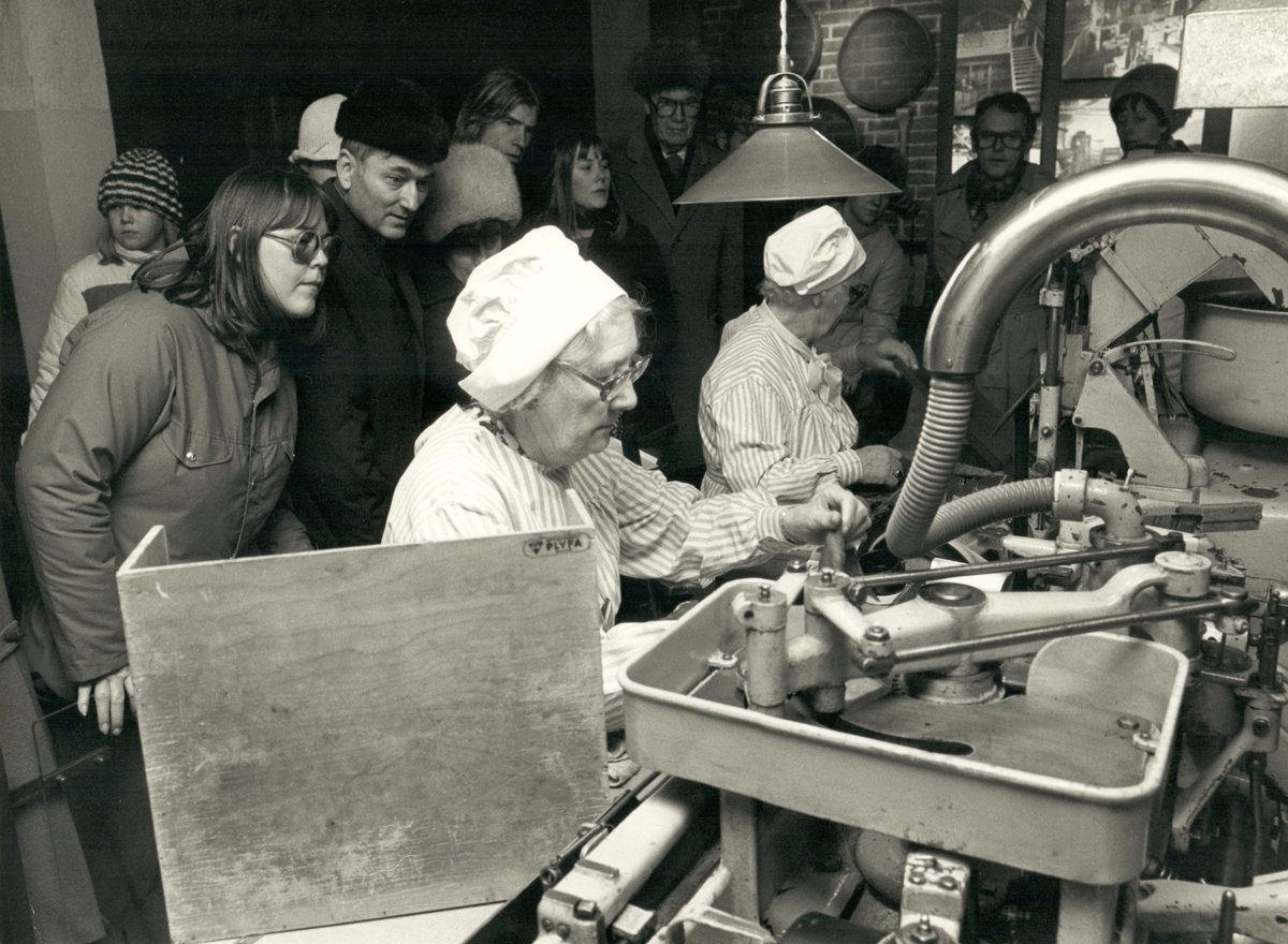 Museibesökare ser på när tobaksfabrikanter jobbar i "fabriken" i Tobaksmuseet.